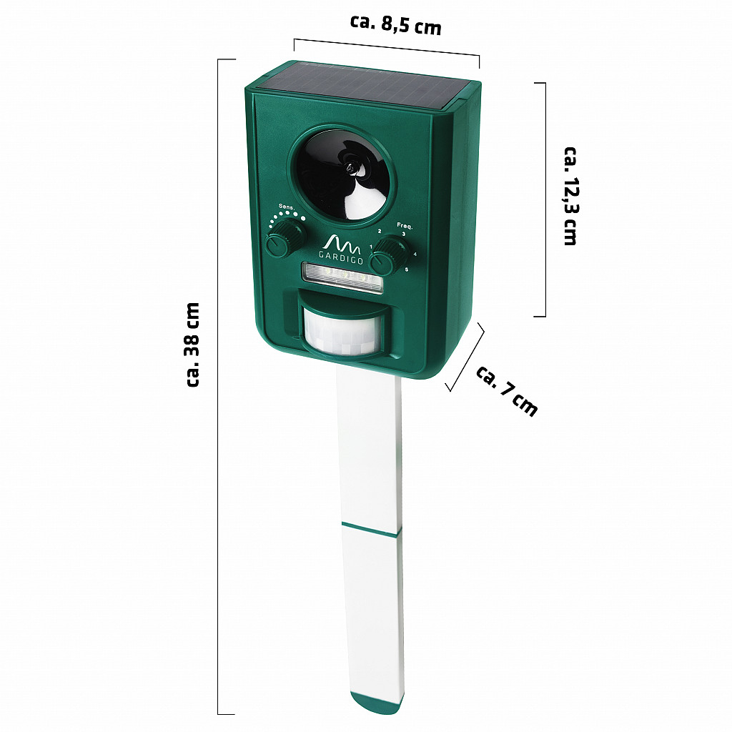Težave z nezaželenimi živalmi na vrtu ali na zemljišču so lahko zelo različne: potepuške mačke, psi, ki opravljajo potrebo na dvorišču, agresivne kune, miši kot škodljivci v shrambah ali divji prašiči, ki razrijejo vrt. Zaradi nastavljivega frekvenčnega območja lahko živali odganjate ciljno. Naprava ima 5 nastavljivih stopenj:
